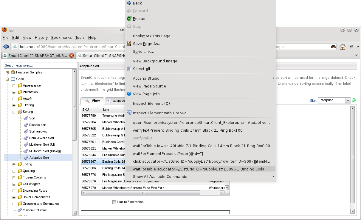 Sometimes users may also want finer grain control of what Selenium command is created instead of having the Selenium IDE recorder do this automatically. For example if you want to verify the value of a particular cell in a ListGrid. Instead of typing in the command "verifyTable" and manually enter the Smart GWT Locator (scLocator), you can simply right click on the table cell or any other Smart GWT widget and the most suitable Selenium commands will appear in the context menu along with the scLocator path for the clicked element. See image below.